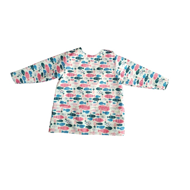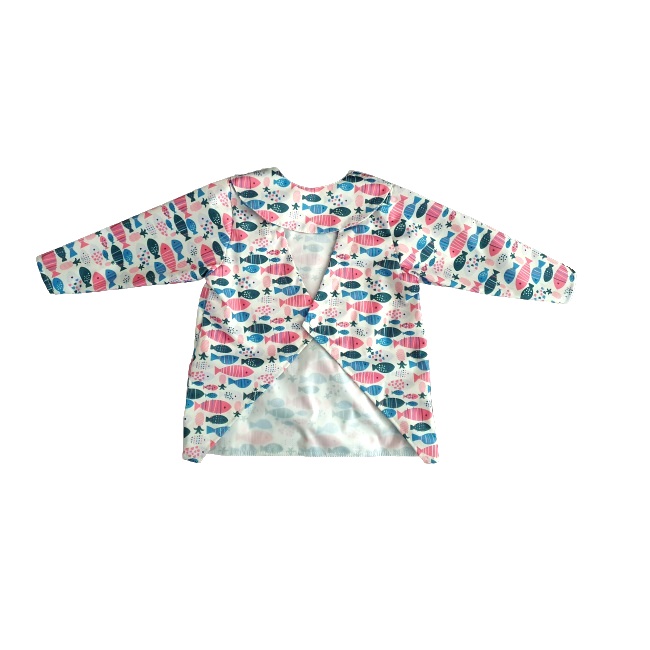 Baveta cu mâneci de la Analuca este confecționată din material impermeabil și respirabil de tip PUL, identic cu partea exterioară a scutecelor textile.