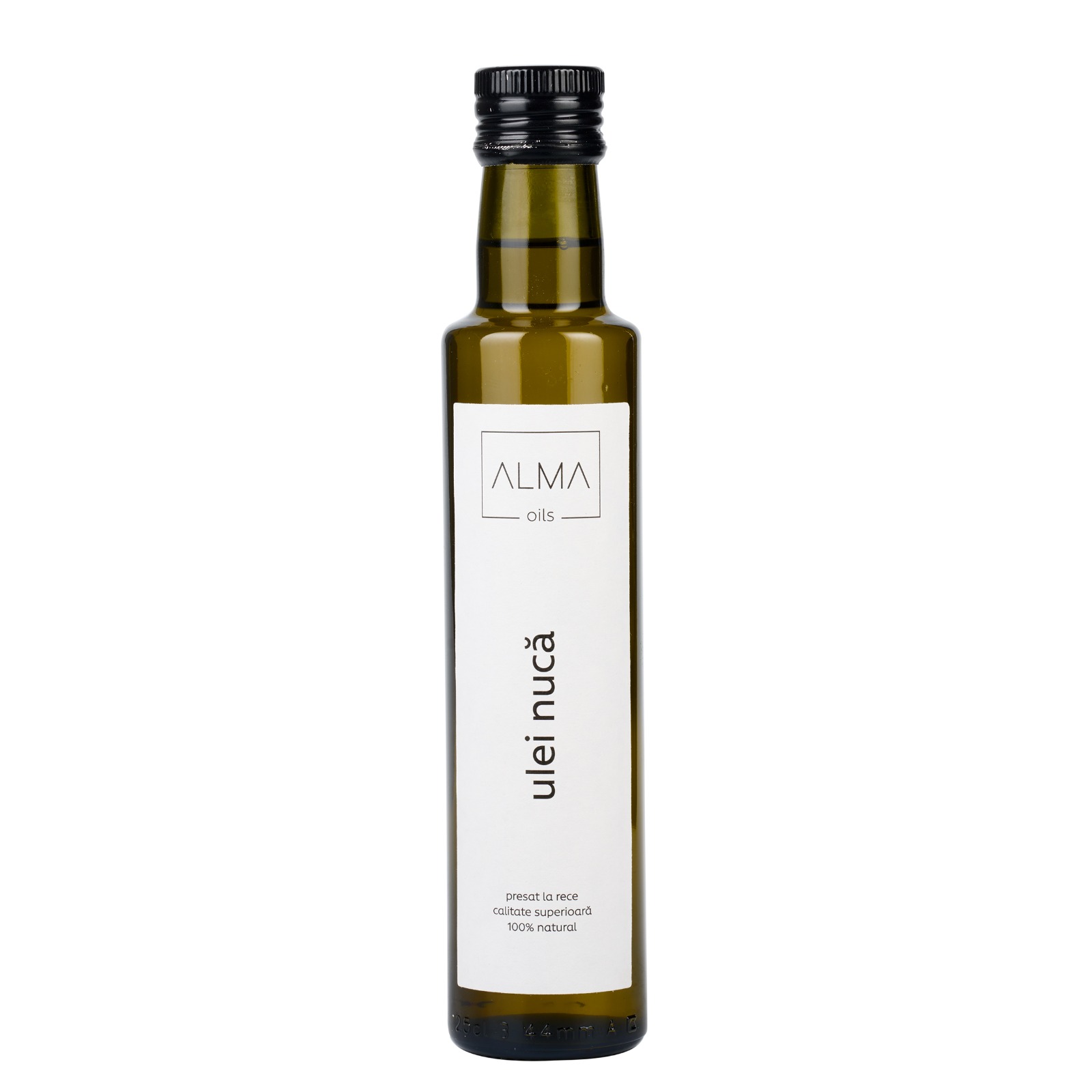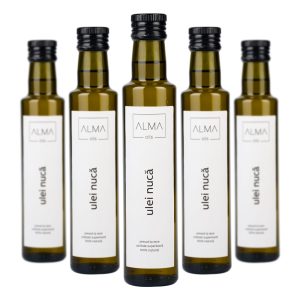 Uleiul de nucă de la Alma Oils este un produs de calitate superioară, 100% natural, cu un gust delicios de nucă și o culoare galben aurie, realizat cu grijă si pasiune, exclusiv prin tehnologia presării la rece a miezului de nucă neprăjit. Uleiul obținut în urma presării la rece este lăsat la decantat, iar apoi îmbuteliat în sticle uvag. Pentru a asigura calitatea uleiului o mostră din fiecare lot de producție este supusă testelor de laborator.